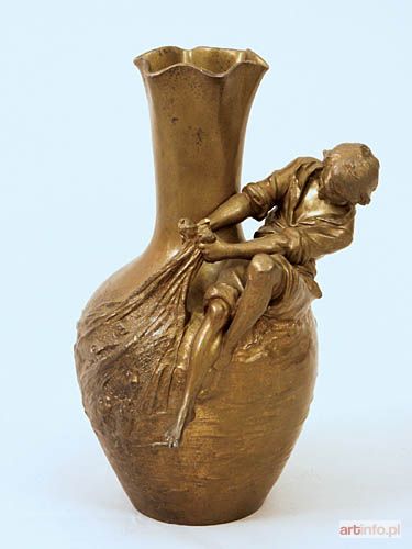z owoidalnym brzuścem i smukłą szyją o rozszerzonym, falistym wylewie; na brzuścu pełnoplastyczna postać chłopca ciągnącego sieć z rybami, oplatającą dół naczynia; sygn. na brzuścu: Aug. Moreau.