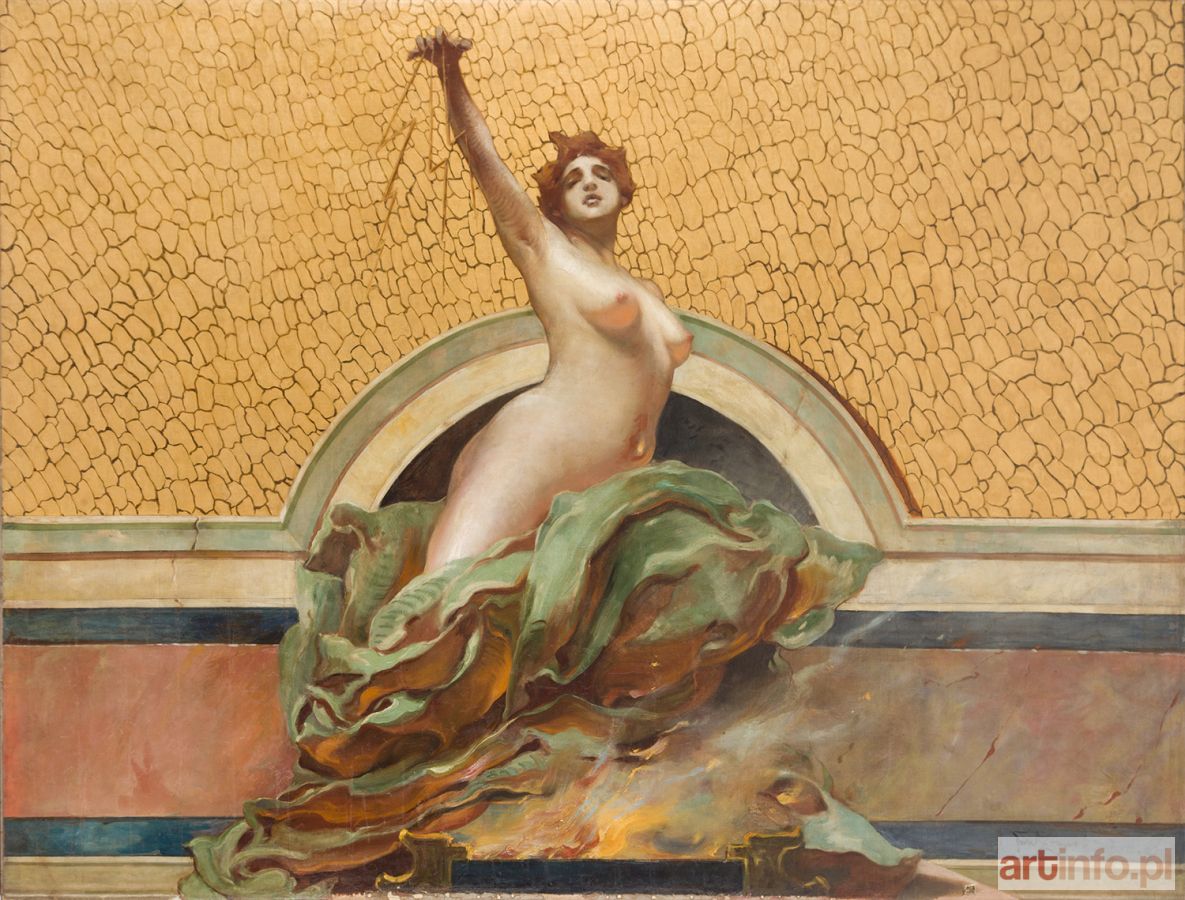 Pyszniąca się złotem kompozycja z personifikacją ognia w części centralnej to wyjątkowy obraz w twórczości Franciszka Żmurki. Praca ukazuje artystę w innej roli niż ta, z którą jest kojarzony. Nie jako malarza heter, ale jako realizatora prestiżowego zamówienia publicznego, w które zaangażowani byli najlepsi malarze tego czasu. I w którym on zasłużenie wziął udział. "Ogień" to symboliczna kompozycja, która razem z pracami malarzy takich jak Wojciech Gerson czy Henryk Piątkowski stworzyła wizualną oprawę dla jednego z najważniejszych wydarzeń Warszawy końca XIX wieku. Niemal za cud, biorąc pod uwagę historię miasta nad Wisłą, możemy uznać fakt dochowania się płótna do naszych czasów w dobrym stanie. Rekonstrukcja całego założenia dekoracyjnego wskazuje, że przyświecała jej prosta myśl. Chodziło o wyczarowanie przed oczami odwiedzających wystawę personifikacji żywiołów czy zjawisk kojarzących się ze zdrowym i higienicznym życiem. Musiały one spełniać dwa warunki - być równocześnie atrakcyjne wizualnie i zarazem czytelne dla przeciętnego odwiedzającego. Oba warunki spełnia prezentowany obraz. Na tle malowanej iluzjonistycznie "mozaikowej" elewacji, w czymś na kształt niszy objawia się kobieca, naga postać gromowładnej. Kształt wirtuozersko malowanej draperii (?) nasuwa skojarzenia z płomieniami. Przy dolnej krawędzi obrazu płonie ogień - konkretyzacja tematu płótna. "Ogień" Franciszka Żmurki zdobił Pawilon Główny na II Wystawie Higienicznej w Warszawie w 1896. Pawilon autorstwa Edwarda Goldberga był dekorowany dziełami malarskimi na obydwu elewacjach. "Piękności" i "Sile" Wojciecha Gersona towarzyszyły: "Ogień" Żmurki i "Woda" Henryka Piątkowskiego. "Ziemia" namalowana przez Kazimierza Alchimowicza oraz "Powietrze" Kazimierza Wasilkowskiego stanowiły uzupełnienie drugiej kompozycji Gersona, "Zdrowie z gór, z nizin mór". Obraz Żmurki jest prawdopodobnie jedynym zachowanym świadectwem artystycznym II Wystawy Higienicznej, jakie dotrwało do dnia dzisiejszego! W zbiorach Narodowego Archiwum Cyfrowego znajduje się zaledwie kilka fotografii z tej niezwykle ciekawej i ważnej ekspozycji.
