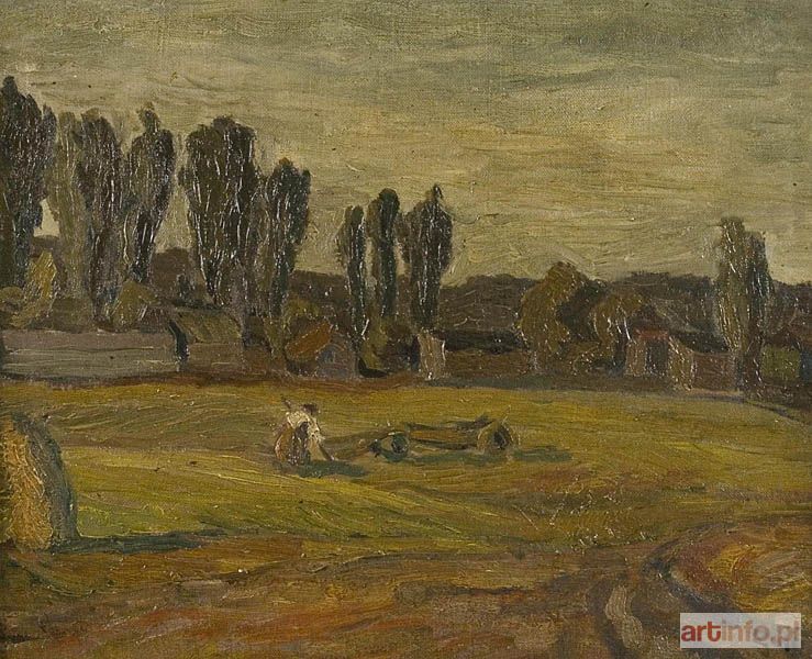 Jan Ruff w latach 1946-1951 studiował na warszawskiej Akademii Sztuk Pięknych w pracowniach Sokołowskiego i Kokoszko. W roku 1958 podróżował do Holandii. Zajmuje się malarstwem sztalugowym, malarstwem ściennym (mozaika, sgraffito) i tkaniną dekoracyjną. W 1957 roku był współzałożycielem i członkiem Spółdzielni "Wzór". Brał udział w wielu wystawach zbiorowych m.in. w warszawskiej Zachęcie. Ulubionymi tematami artysty są pejzaże i portrety. Prezentowana praca pochodzi z wczesnego etapu twórczości. Przedstawia budowane brązami i zieleniami pola, których horyzontalizm złamany jest pionowymi formami topoli. W centrum pochylona postać w jasnej chuście.