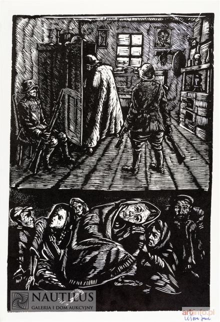 Linoryt, papier; wym.: 350 x 240 mm; sygn. długopisem p. d.: Stern Jonasz; na odwrocie napis ołówkiem l. d.: Kryjówka (1949). Odbitka z lat 70.; grafika z teki "Getto lwowskie". Lit.: Żydzi - polscy. Czerwiec - sierpień 1989, Katalog wystawy w Muzeum Narodowym w Krakowie, Kraków 1989, poz. kat. 1165; J. Stern. Wystawa jubileuszowa styczeń- luty 1985, oprac. J. Chrobak, Kraków 1985, s. 19