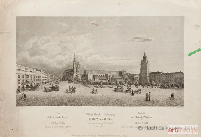 Staloryt; wym.: 273 x 393 mm; sygn. pł. p.d.: Rys Józef Woyciechowski, śr.d.: Drukował w Wiedniu J. Freytag; pod komp. tytuł w jęz. fr., niem. i polskim: Widok Rynku Głównego / Miasta Krakowa / rysowany z natury od zachodu / w R. 1860. Niżej: Ofiarowany przez Redakcyą pierwszym prenumeratorom "Ogniska" [ukazało się 6 tomów w l. 1860-1865]. Stan zachowania: zaplamienie p. marginesu bez szkody dla kompozycji.