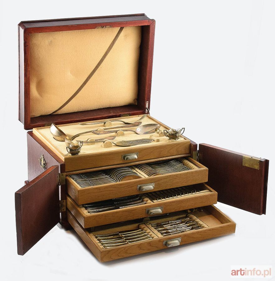 Składający się z 12 widelców i noży do drugiego dania (dł. 21,4 cm i 26 cm), 12 łyżek do zupy (dł. 21,6 cm), 12 widelców i noży do przystawek (dł. 18,6 cm i 21,6 cm), 12 łyżek do bulionu (dł. 18 cm), 12 łyżeczek do herbaty (dł. 14,6 cm), 12 łyżeczek do kawy (dł. 10,8 cm), 12 widelczyków i noży do owoców (dł. 15,2 cm i 17 cm) oraz 13 sztućców środka stołu - dziadek do orzechów (dł. 15,6 cm), widelec i 2 łopatki do ryb dekorowane motywem roślinnym i rybami (dł. 25 cm i 27 cm) , para solniczek dwuusznych ze szklanymi wkładami (wys. 4,8 cm, szer. 8 cm) i 2 łyżeczki do soli (dł. 7,5 cm), łyżka wazowa z czerpakiem wewnątrz złoconym (dł.35 cm), chochelka do sosów (dł. 18,5 cm), łyżka i widelec półmiskowe (dł. 26,5 cm i 26,5 cm), łopatka do ciasta (dł. 27,2 cm) dekorowana motywem groteski; umieszczone w kantynie drewnianej z czterema szufladkami, wyłożonej irchą; poza kantyną 12 widelców i noży do ryb (dł. 18,3 cm i 20,6 cm). Trzonki dekorowane motywem profilowanej taśmy z przewiązkami oraz liśćmi laurowymi i festonem laurowym; trzonki noży, widelczyków i nożyków do owoców, widelca i łopatek do ryb środka stołu oraz ramiona dziadka do orzechów dociążone; ostrza noży, widelczyków do owoców stalowe; ostrza nożyków do owoców, widelca i łopatek do ryb oraz cęgi dziadka do orzechów z metalu złoconego.