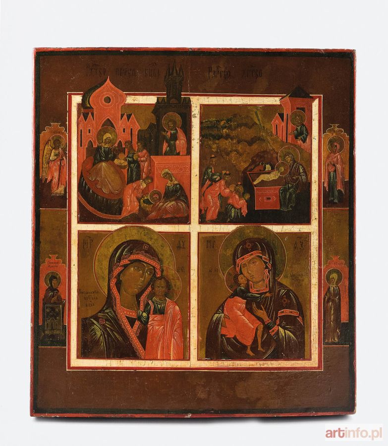 Ikona podzielona na 4 kwatery z białą obwódką: u góry z lewej - Narodziny Marii, z prawej Boże Narodzenie; poniżej z lewej - Hodegetria - Matka Boska Kazańska; z prawej Eleusa - Umilenije - Matka Boska Fiodorowska. Bordiura szeroka, brązowa, z klejmami: z lewej Anioł Stróż i święty mnich Makary Słupnik, z prawej nierozpoznana święta i Maria Egipcjanka. Koloryt całości: brąz, ugier, oliwka, ceglasta czerwień. Obraz po konserwacji.