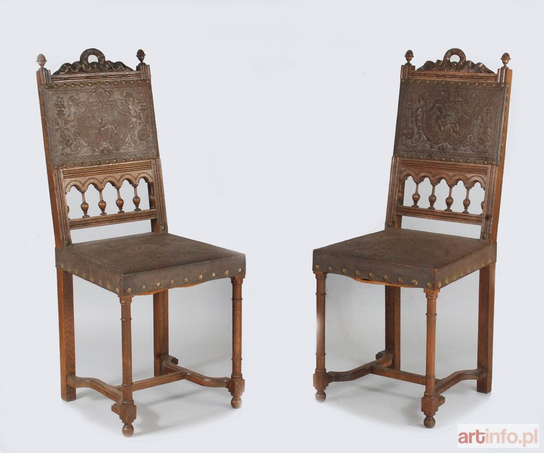 o konstrukcji rzeźbionej i toczonej, krytych wytłaczaną skórą na oparciach i siedzeniach, konstrukcja: dąb; 103,7 x 41,5 x 45 cm; Europa Środkowa, XX w.
