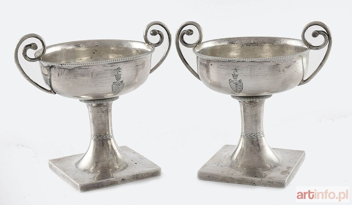Na kwadratowych stopach przechodzących w wąski, wysoki trzon ujęty w pas stylizowanej gałązki, z kolistą czarą z perełkowaną krawędzią, z wolutowymi uchwytami z boków; na czarce grawerowany herb Ślepowron z klejnotem.