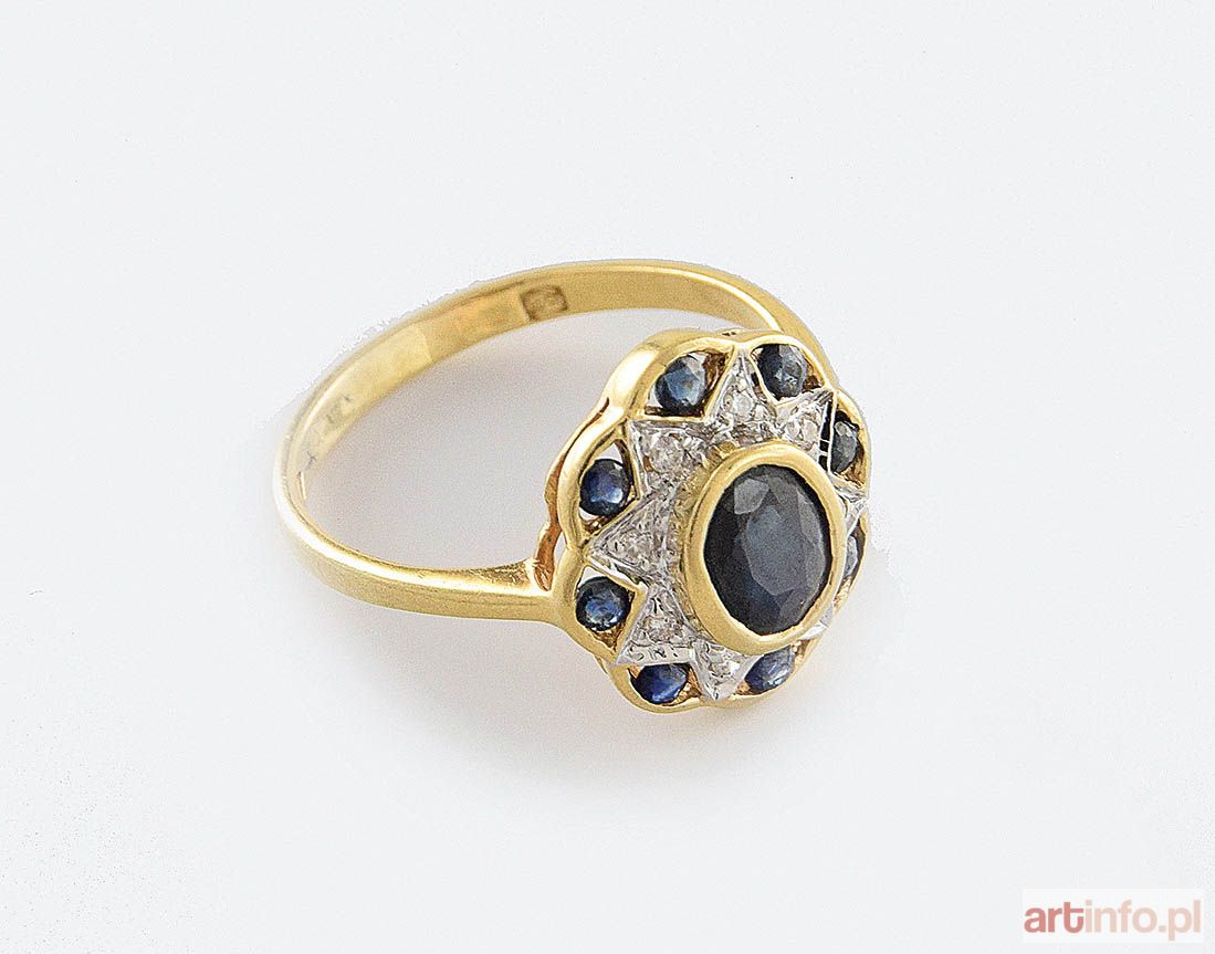 okrągła, ażurowana kompozycja z naturalnym fasetowanym owalnym szafirem w centrum o masie ok.1.50 ct , 8 szt brylantów o masie łącznej ok.0.05 ct (Si-P2/G-H) oraz 8 szt okrągłych szafirów o masie łącznej 0.22 ct, złoto pr.0.750, masa całkowita 3.475 g.