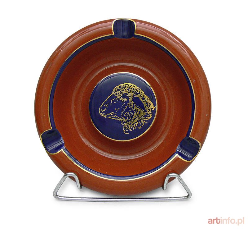 glina, malowana kobaltem, szkliwiona, złocona; w lustrze głowa owcy; na spodzie znak wytwórni i numer modelu „1000 I”; wys. 3,4 cm, śred. 16,6 cm
