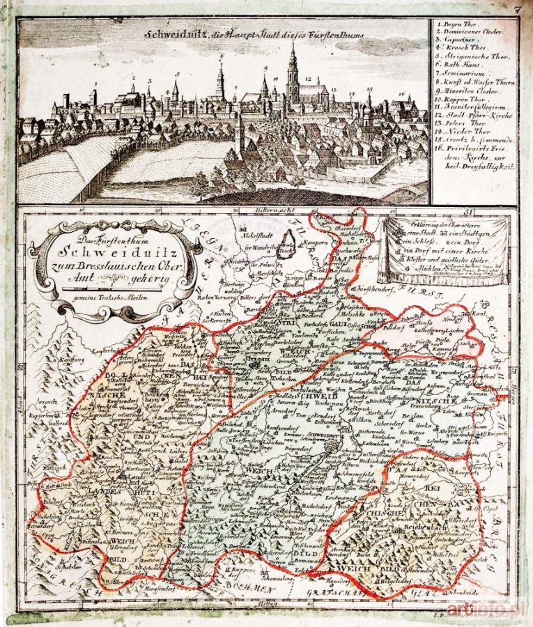 Panorama miasta autorstwa Friedricha Bernharda Wernera, poniżej mapa Księstwa Świdnickiego; ryt. i wyd. Johann David Schleuen, Berlin 1741; na verso nieaktualna pieczęć własnościowa; miedz. kolor. z cz.-b. panoramą, st. bdb., zabrudzenia marginesów, pod widokiem miasta przebicie pieczęci z verso, przycięty górny odcisk płyty; wymiary ryciny: 253x303 mm; tyt. panoramy: Schweidnitz, die Haupt-Stadt dieses Fürstenthums; tyt. mapy: Das Fürstenthum / Schweidnitz / zum Bresslauischen Ober // Amt gehörig; [Imago Silesiae... 152 – różnice w tyt.]
