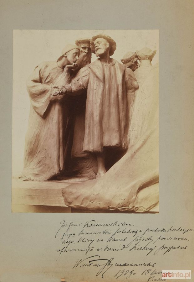 Grupa humanistów polskich (m.in. Jan Kochanowski) z projektu rzeźbiarskiego: Pochód na Wawel. Kraków 1909. Zakład Fotografi czny A.(ntoniego) Pawlikowskiego. Projekt rzeźbiarski Wacława Szymanowskiego fotografia 29 x 23,4 cm, naklejana na karton z epoki (50 x 37 cm); sygn. na odwrocie pieczęcią tuszową zakładu.