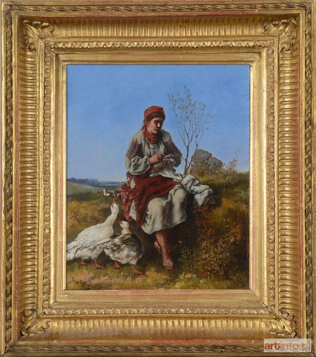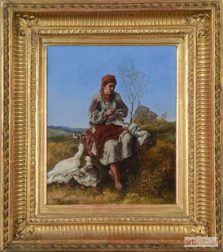 olej na desce mahoniowej, fazowanej, 20,5 x 16,6 cm, sygnowany l.d. "Tadeusz Rybkowski": na odwrocie, na desce kartka XIX-wieczna [wystawowa?] z tytułem "Gänsemädchen". W złoconej ramie z epoki.