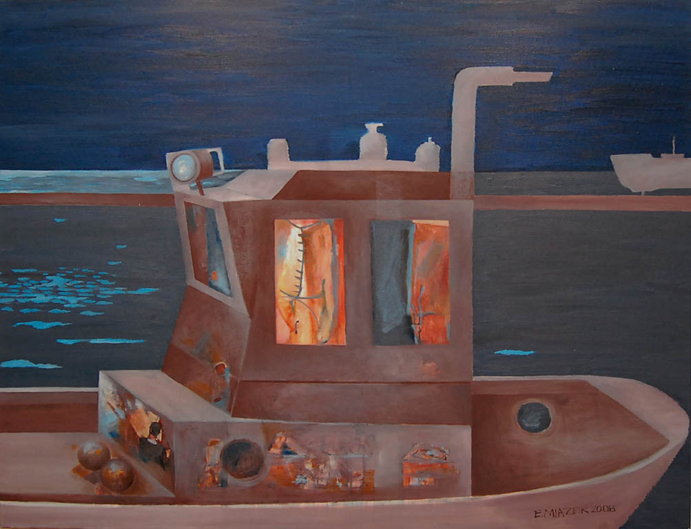 Drugim tematem, który pojawia się w obrazach Ewy Miazek są barki. Zauroczyły ją one już w dzieciństwie. Pływające po rzekach służą ludziom za środek transportu, schronienie, czy wreszcie stają się domami na wodzie. Chociaż na obrazach pojawiają się samodzielnie to zawsze z sugestią, że mają swoich właścicieli, lokatorów. Dym z komina, ruch w sterówce sprawiają, że patrząc na nie wiemy, że nie funkcjonują bez człowieka, który je zbudował i któremu służą do realizacji jego celów. Poza tym, szczególnie, gdy mają za sobą wiele lat na wodzie stają się wdzięcznym tematem malarskim. Patyna i rdza sprawiają, że zyskują duszę.