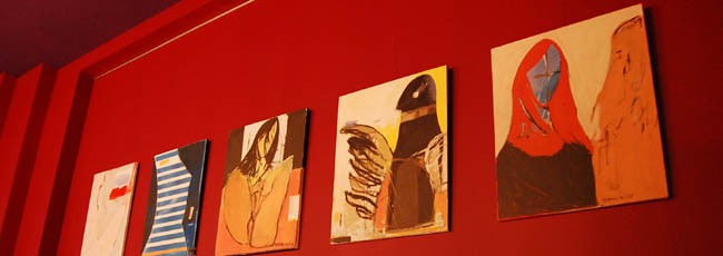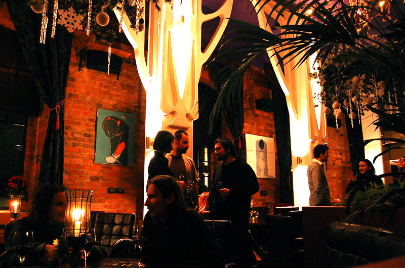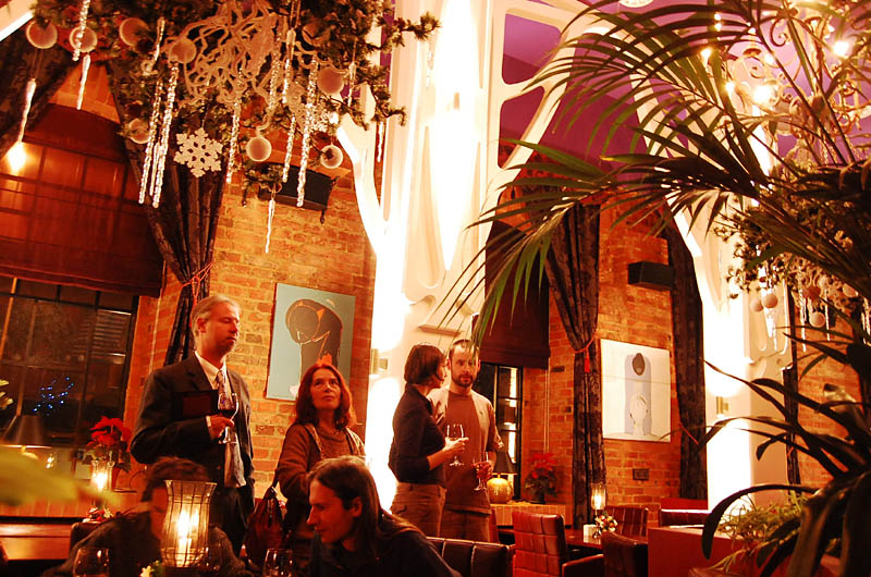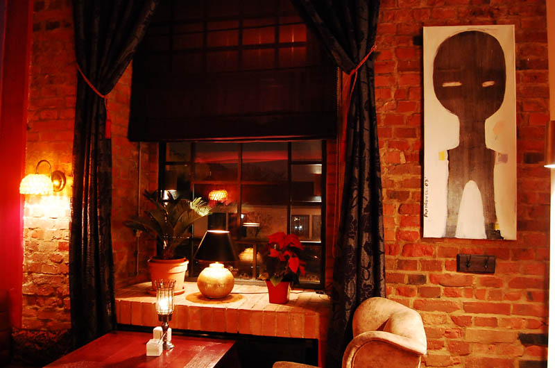 Klimat wnętrza lokalu nie nawiązuje do praskiego otoczenia, a przeciwnie - tworzy ekskluzywną oprawę, podkreśloną bogatą aranżacją, stawiającą na dekoracyjność i wygodę. Mimo takiego pomysłu na przestrzeń znalazło się tu odpowiednie miejsce na sztukę. Ogromna, pusta, pomalowana "muzealną" czerwienią ściana nad barem stanowi bardzo dobre passe-partout dla współczesnego malarstwa. To ona czyni 80 % przygotowanej wystawy, korespondując z niewielką ilością prac umieszczonych między filarami po przeciwnej stronie lokalu.