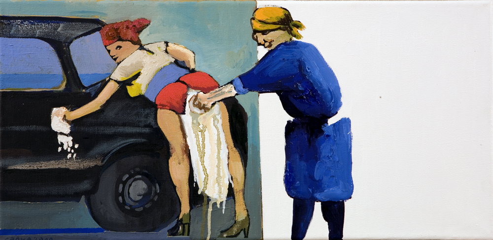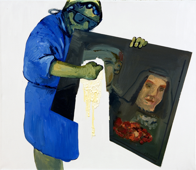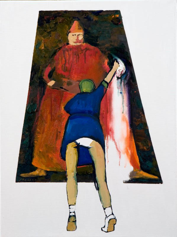 Porządek zrobi tu sprzątaczka w zapamiętaniu usuwająca malowidła z tła, nie bacząc jakiego nurtu przedstawienie dotyczy. Spod szmaty, zmywającej formy i kolory spływają, abstrakcyjne już fakturalne strugi farby. Inne miejsca wyczyszczone są do bieli i ten brak jest chyba jeszcze bardziej frapujący niż wcześniejsza obecność.