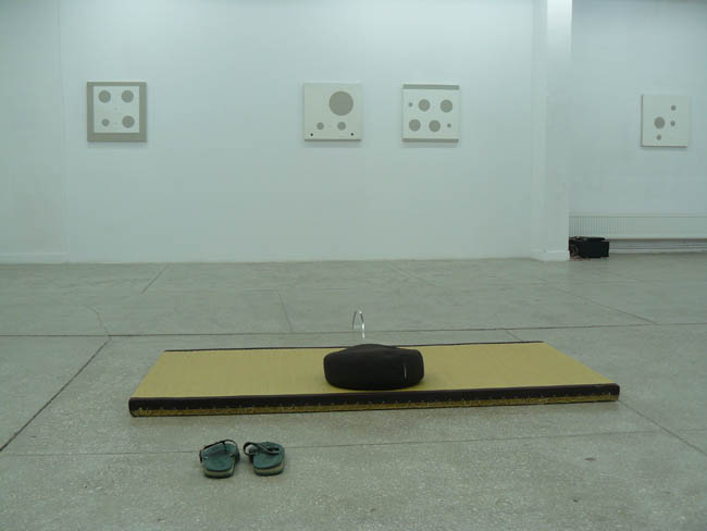 Jednak reszta prac utrzymana jest w kontemplacyjnym charakterze. Mówi o tym wprost znajdująca się w centrum przestrzeni wystawy tytułowa praca Mnich, która zachęca do „zanurzeniu się we własnym ja”. Składają się na nią: mata, położona na niej poduszka, klapki oraz wygięta blaszka, która od wielu lat symbolizuje, jeden w z najważniejszych symboli w sztuce Kamoji - wodę. Artysta obficie czerpie z japońskiej kultury, z której pochodzi – w cyklu Projekty ogrodu nawiązuje do tej niezwykle ważnej w kraju kwitnącej wiśni działalności kształtowania przestrzeni. Kamoji ma bardzo subtelny repertuar środków formalnych, ale zawsze są one znaczące, jak w przypadku kamyków, których używa w opisywanym wyżej cyklu, a które także pojawiają się w pracach z serii Małe obrazy - Naczynie może być proste.