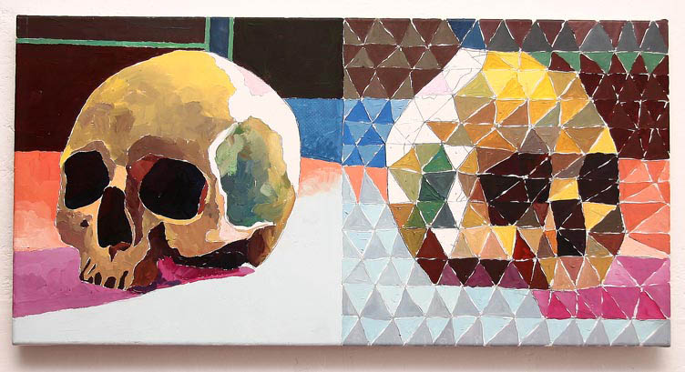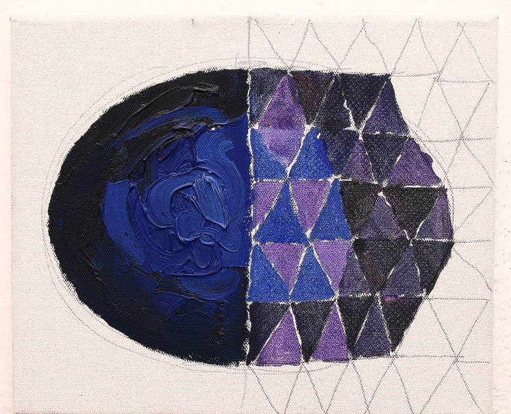 Na wspominanym wcześniej zdjęciu stoję w świetle, w bieli, czyli w mieszance kolorów wg Newtona i rzucam cień na ścianę, czyli mrok wg Goethego. To przetworzone zdjęcie wykorzystałem do namalowania w 2010 roku obrazu "Cień malarza". Po jego lewej stronie znajduje się zarysowana bielą moja postać. Prawa strona pokryta jest przemiennie wzorem trójkątów namalowanych żółcią, czerwienią, błękitem, bielą i czernią. Przypomina to system CMYK stosowany w drukarstwie, czyli Cyan (błękit), Magenta (czerwień), Yellow (żółć) i Key (klucz). Klucz to wg nazewnictwa angielskiego ostatnia zamykająca matryca druku pokryta czernią, która nasyca wymienione wcześniej barwy. Czerń zamyka biel, z kolei bez bieli czerń jest mrokiem. W przypadkowym zdjęciu w symboliczny sposób zawarła się pewna porcja mojego rozumienia malarstwa doświadczanego racjonalnie i intuicyjnie.
