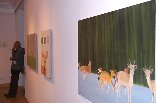 Na wystawie, Magdalena Karpińska, prezentuje obraz Mrówkojad w górach. Jest to niepokojący obraz, ale z drugiej strony wywołuje uśmiech. Mamy góry, turystów odwróconych plecami do głównego planu, którzy oddają się kąpieli słonecznej, i jakby nigdy nic, lawirującego między leżakami mrówkojada. Zwierzę jak z kreskówki, które nie wzbudza żadnego zainteresowania turystów. Kolejnym ciekawym elementem obrazu jest statek płynący w chmurach. Efekt, jakby źle zamalowanego tła, kryjącego obraz w obrazie. Odczytuje się pewną groteskę w tym działaniu, zabawę, ale też uczucie niepokoju. Mimo radosnej kolorystyki i skąpanych w słońcu gór, pojawia się mrówkojad, którego nie powinno tam być. Podobne odczucie wzbudza obraz 97. Niebieskie niebo, łąka, drzewa i cztery osoby na pikniku. Jednak znowu coś nie gra, postaci są lekko uśmiechnięte, ale smutne i siedzą przy jednym suchym drzewie bez liści. Ta dwu biegunowość da się odczytać na wielu obrazach artystki.