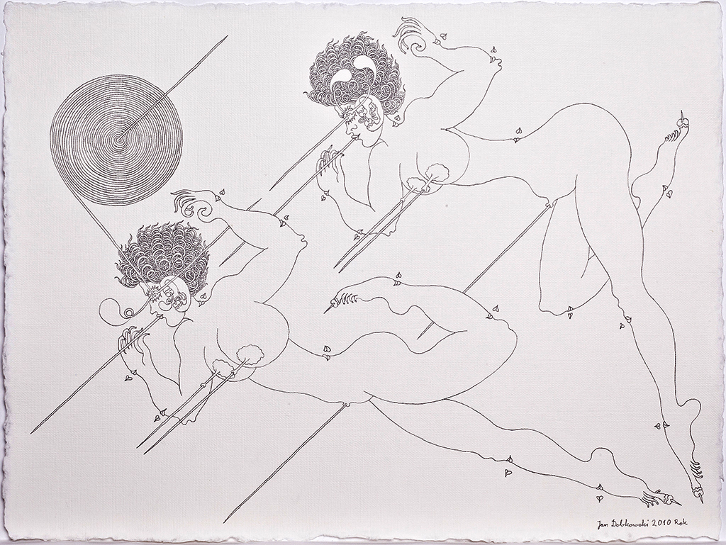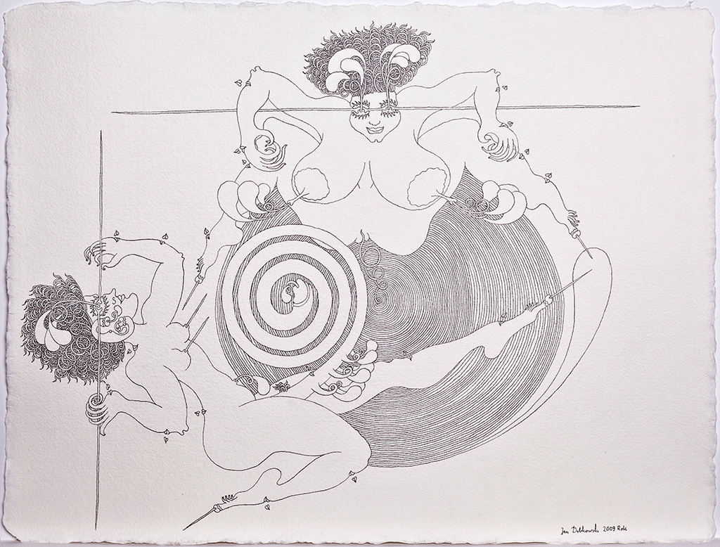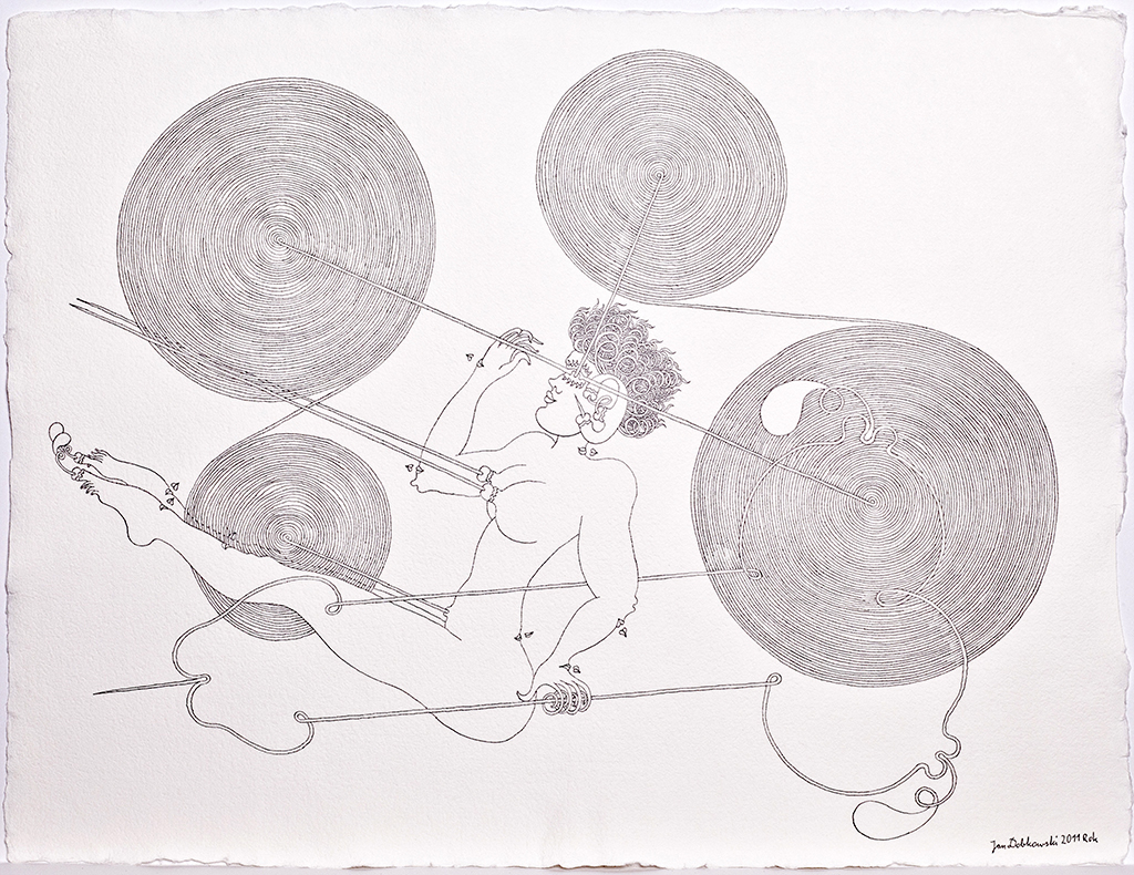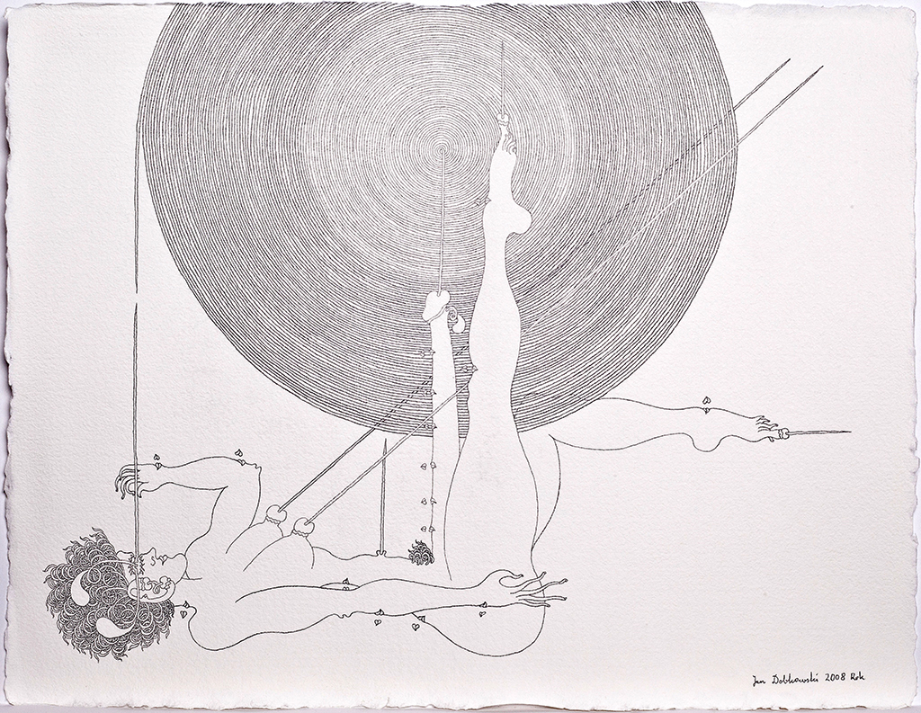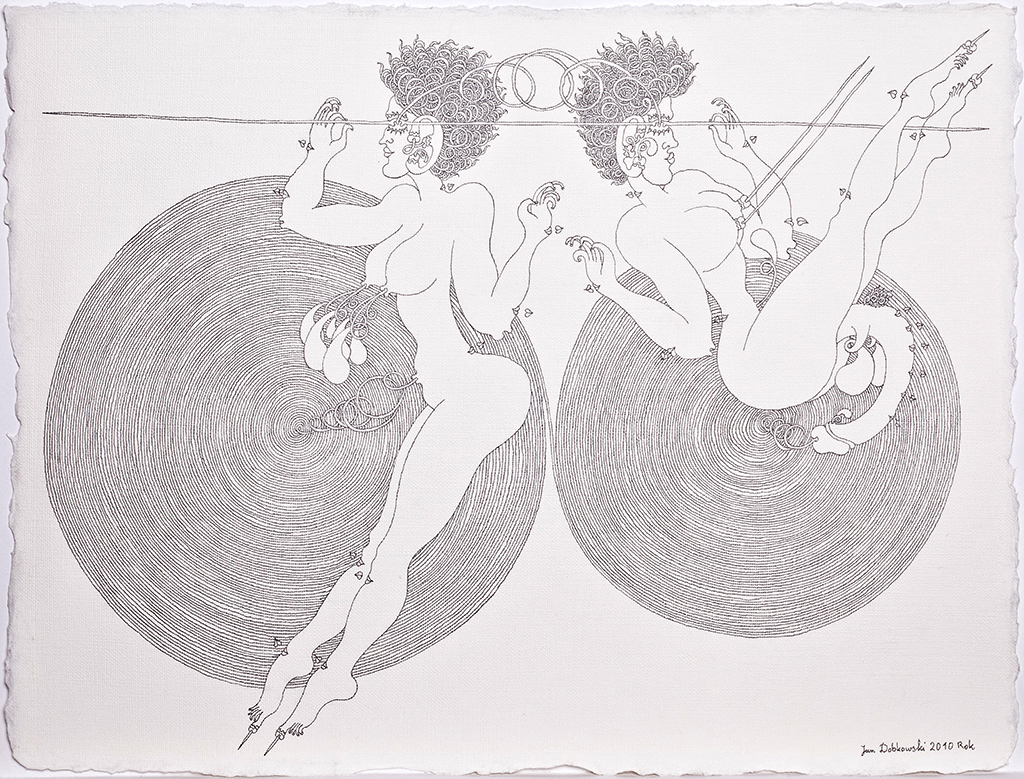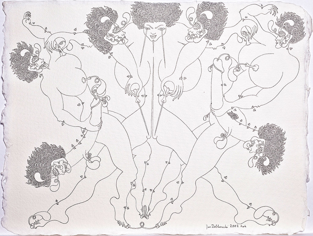 Te finezyjne rysunki przypominają nieco sztukę japońską, z jej mistrzowsko prowadzoną linią i pełnymi elegancji kształtami, z drugiej strony przywołują pewne elementy sztuki indyjskiej i jej ornamentalnie traktowane ludzkie ciało. Jednak oryginalność i niepowtarzalność kreski Jana Dobkowskiego, jego charakterystycznych form i pięknych kompozycji czyni z nich unikat na skalę światową. To niejako opera omnia artysty, podsumowanie jego dotychczasowych doświadczeń, jego osobista wypowiedź na temat sensu istnienia. Filozoficzny paradygmat dotyczący obecności człowieka we wszechświecie, czerpania kosmicznej energii życia.