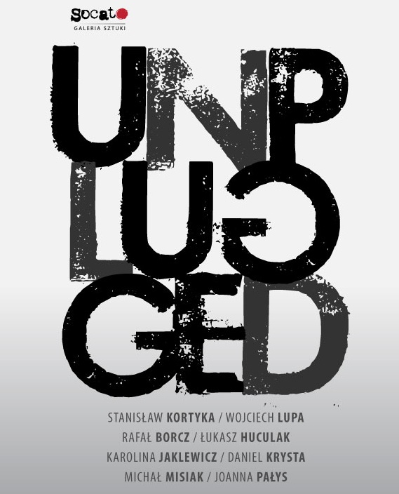 Tytuł wystawy sugeruje odłączenie - od prądu, głównego nurtu, off line. Czy poza siecią istnieje świat? W jaki sposób go percypujemy? Gdzie się znajdujemy, kiedy jesteśmy unplugged? Mimo, że strach przed niezałapaniem się, przed utratą informacji, odcięciem - jest jednym z największych lęków współczesności - unplugged kojarzy nam się z ulgą, spokojem, czymś kameralnym, bardziej intymnym, bliskim skórze – może prawdziwszym? Czymś elitarnym, co przedstawia nową wartość, jak „najmniejsze koncerty świata”, wieczór na gołej ziemi z gołą głową i boso. To pełniejsza komunikacja, bliższy kontakt na linii nadawca-odbiorca. Sugestia, że malarstwo jest ciepłym, wilgotnym medium (w odróżnieniu od nowych technologii). Obrazy pokazane przez Socato mają w sobie ten strumień ciepła, działają kojąco. Jest w nich rodzaj trudnej równowagi, buddyjskiego zawieszenia broni. Na obrazach Karoliny Jaklewicz formy odpychają się i przyciągają, są w stanie kruchej równowagi, balansu, który utrzymuje jakaś (nad)naturalna siła. Namagnesowane figury zawieszone w odległościach wytwarzają napięcie, które nie jest elektryczne (uplugged) – wynika raczej ze stosunku figur objawiających idealne proporcje. Jak ciała niebieskie na mapie nieba – księżyce, zjawiska i przedmioty, które zintegrowaliśmy jako „świat”. Rozpoznajemy więc te figury jako archetypowe. Inaczej o doskonałości mówi Daniel Krysta - używa do tego figury koła, które konkretyzuje jako metalowe fragmenty mechanizmów, abstrakcyjne detale, jakie wypadły ze snu o erze posttechnologicznej. Postindustrialne śmietnisko: w tym kontekście pojęcie unplugged mówi o rozczarowaniu współczesnością jako futurystycznym marzeniu o świecie bez czasu i śmierci. Rafał Borcz odłącza się w sposób najbardziej dosłowny – poprzez pejzaż, ostentacyjnie analogowy, nie-miejski, zredukowany do kilku detali, elementów takich jak drzewo, słońce, rzeka. Nadmiar impulsów atakujących wielkomiejskiego flaneura zostaje rozproszony w ścianie tiulu, mgle, mniej lub bardziej nasyconej bieli. To świat organiczny, ale odległy, surrealistyczny przez odrealnienie, wyabstrahowanie detali. Baśń, waldenowski sen o lesie bez cywilizacji i związanych z nią zagrożeń. Zaskakujące w tym kontekście są prace Michała Misiaka – psychodeliczne mandale, pulsujące membrany, radiowe fale w układach i jaskrawych, przemysłowych kolorach – kapitalnie kontrują narrację o bieli, wyciszeniu, dojrzałej doskonałości. Unplugged staje się tu samo malarstwo, powracające do źródeł, angażujące narzędzia, które bywało – wydawały się już archaiczne. Ten element, umowny wyłom w systemie, paradoksalnie jeszcze mocniej go spaja. Na płótnach toczy się mikro życie, życie w domyśle – stłumione, albo dopiero wykluwające się. Dlatego uwagę przykuwa obraz Łukasza Huculaka, na którym artysta umieścił postać – przykucniętą w teatralnej pozie i przebraniu, wykonującą jakiś surrealny ruch. Mężczyzna dotyka końcem wskaźnika astralnego ciała, transparentnej materii. Jakby tresował amorficznego ducha, jakby ten hologram, powidok, wywiązywał się z metalowego prętu. Widz ma wrażenie, że to seans spirytystyczny albo doświadczenie alchemika. Jego treść pozostanie zagadką, wyczerpuje się w intrygującym obrazie. W Socato pokazano także prace Wojciecha Lupy, wielkoformatowe abstrakcje, ekrany bieli, zza których przeziera to, co ukryte pod podszewką rzeczywistości potocznej. Opowieść zamykają postindustrialne narracje Joanny Pałys, która dotkliwie pokazuje melancholię wielkomiejskiej architektury. Strzeliste przęsła mostu jako postnowoczesny gotyk - monumentalna historia o tęsknocie za absolutem. I na koniec – kamienny labirynt Stanisława Kortyki: nierzeczywisty, nieruchomy. Kres podróży flauneura eksplorującego metropolię. Zgaszone światło, żadnego ruchu. To ostatnia stacja: unplugged.
