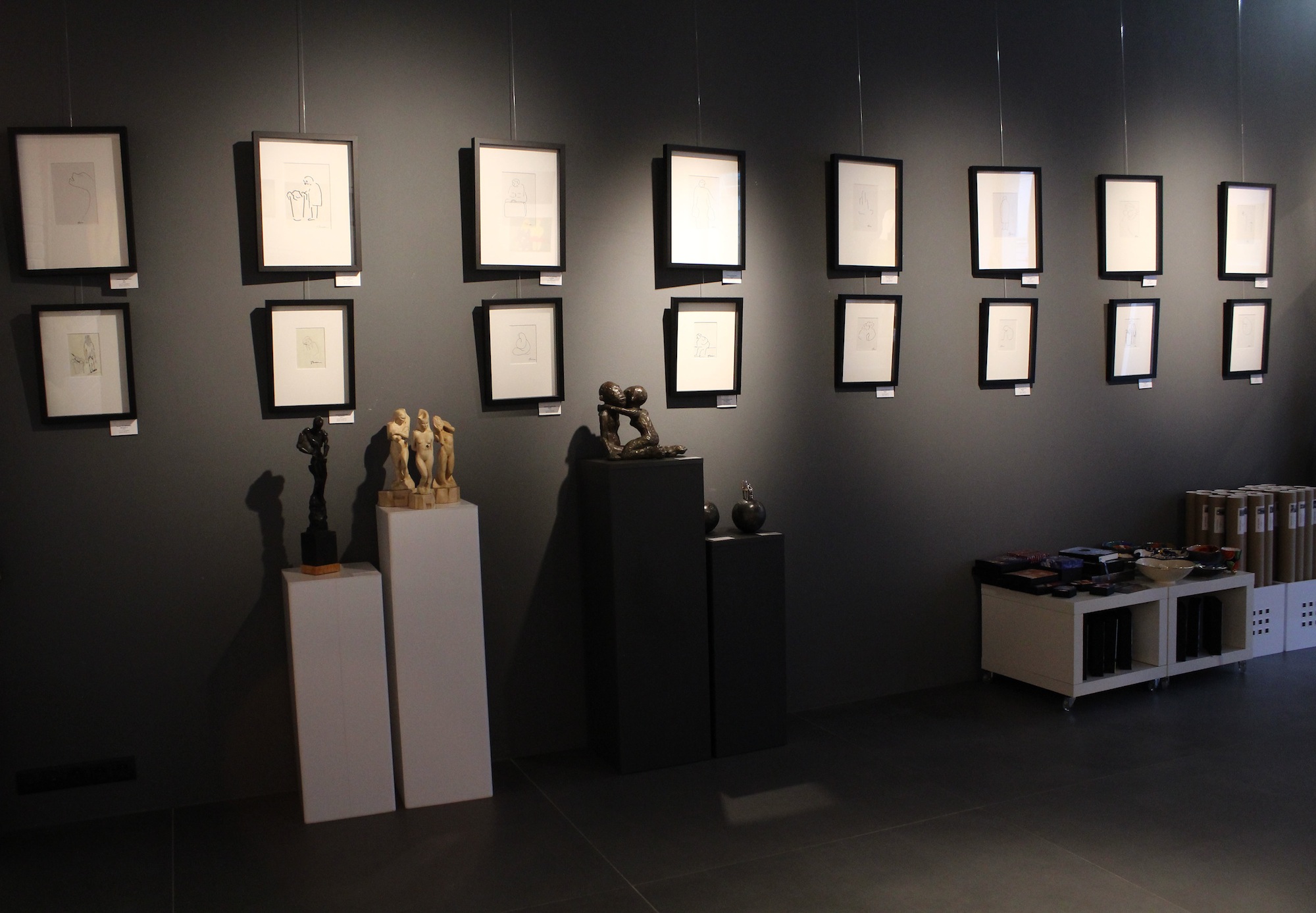 Joanna Szczepkowska wystąpiła w nowej, zaskakującej roli autorki prac plastycznych. Po raz pierwszy zdecydowała się na upublicznienie swoich rysunków w 2000 roku. Wykorzystała je w zbiorze felietonów Drugie podwórko. Delikatne niczym pajęczyna, w sposób aluzyjny odwoływały się do treści poszczególnych tekstów, lub stanowiły rodzaj dyskretnego ozdobnika. Taki był początek artystycznej przygody, która z czasem przerodziła się w autentyczną pasję. Rysunki Joanny Szczepkowskiej przyciągają wzrok wyrafinowaną prostotą i czystością formy. Wizualnie urodziwe, działają na wyobraźnię, prowokują do rozszyfrowania treści zapisanych na nieskazitelnej bieli papieru nieomylną czarną kreską. Nie szuka wielkich tematów, odnajduje je w codzienności. Bohaterami jej rysunków są zwykli ludzie przeżywający swe małe lub wielkie dramaty. Anonimowi przychodnie, w tajemniczy sposób wyróżniający się z tłumu, ludzie z marginesu. Z natury jest ogromnie wrażliwa, przepełniona uczuciem empatii, stąd jej Pijacy i Menele są pełni życia, radośni; nie budzą odrazy, ale sympatię. Niektóre wątki prowokują do kolejnych opracowań. Tak, więc powraca wizerunek bezdomnego skrzypka. Przejmująca w swej wymowie metafora losu zagubionych, zapomnianych artystów… Postacie są zazwyczaj pozbawione atrybutów; autorka wprowadza je, kiedy uzna, że ich obecność buduje dramaturgię. Taką rolę pełni śmietnik, miseczka na jałmużnę i filiżanka stojąca na atrapie kawiarnianego stolika. Większość prezentowanych na wystawie rysunków, ma formę otwartą. Giętka, pewnie prowadzona linia jedynie częściowo wydobywa zarys postaci. Ale potrafi też zapętlić się w miękki celnie zdefiniowany kształt. Spotkamy również przykłady kompozycji budowanych przy użyciu krótkich odcinków pospiesznie położonej ekspresyjnej kreski. Nie budzi zdziwienia fakt, że wszechstronnie uzdolniona i wciąż poszukująca nowych form wypowiedzi autorka, po długim okresie fascynacji rysunkiem, sięgnęła po kolor. Prezentowane na wystawie obrazy zostały zrealizowanie w ciągu trzech minionych lat przy użyciu techniki komputerowej. Graficznie czysty rysunek zastąpiła zróżnicowaną plamą koloru, położonego cienką matową warstwą lub gęstniejącego do emalierskich połysków. Eksperymentuje poszerzając zakres rozwiązań formalnych. Próbuje wypowiedzi w różnych konwencjach. Bywa oszczędna jak w moim ulubionym Swetrze, lub szczelnie na zasadzie horror vacui - zapełnia cały prostokąt kompozycji sylwetkami barwnie ubranych bywalców kawiarni. Znacznie poszerzyła i wzbogaciła zakres inspirujących ją tematów. Zaczyna rozwijać je w cykle. Warto w tym miejscu wspomnieć intrygującą serię prac, do której należy zaliczyć Ciało oraz jego powiększone do nadnaturalnych rozmiarów fragmenty - Usta i Ucho. W szeregu prac wykorzystuje fotografię (m.in. trzy Autoportrety). Wierzę, że zwiedzanie wystawy Joanny Szczepkowskiej było dla Państwa równie fascynującym przeżyciem, jak mój pierwszy kontakt z jej pracami.