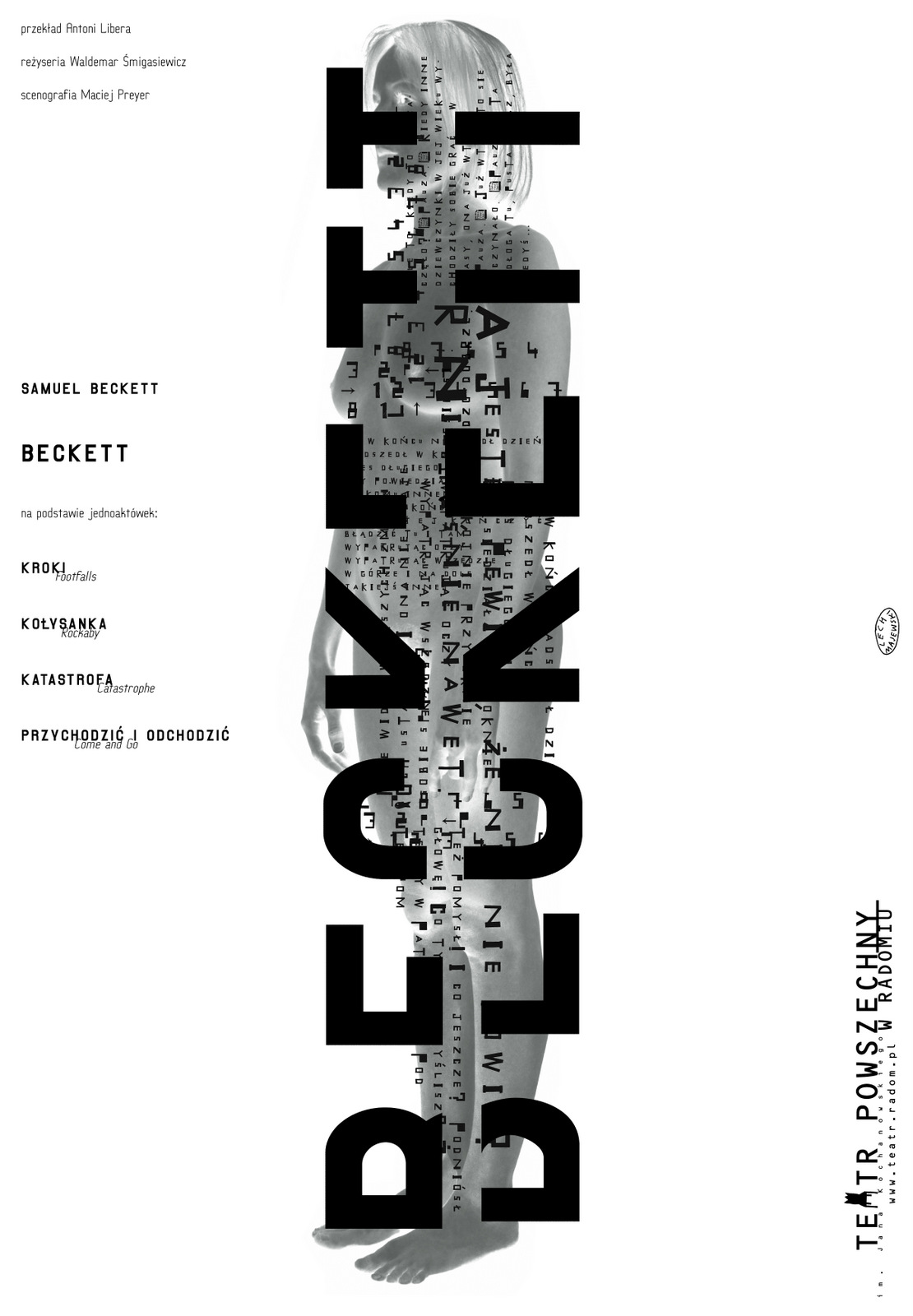 Plakat Lecha Majewskiego do serii spektakli na podstawie sztuk Samuela Becketta w Teatrze Powszechnym w Radomiu prezentuje kontrastowe podejście do typografii. Rozdźwięk między wydatnością nazwiska dramaturga a subtelnymi liniami tekstu, które być może sugerują ciąg myśli i wewnętrznych głosów, jest bardzo efektowny. Negatyw kobiecej sylwetki również budzi skojarzenia ze sferą egzystencjalną.