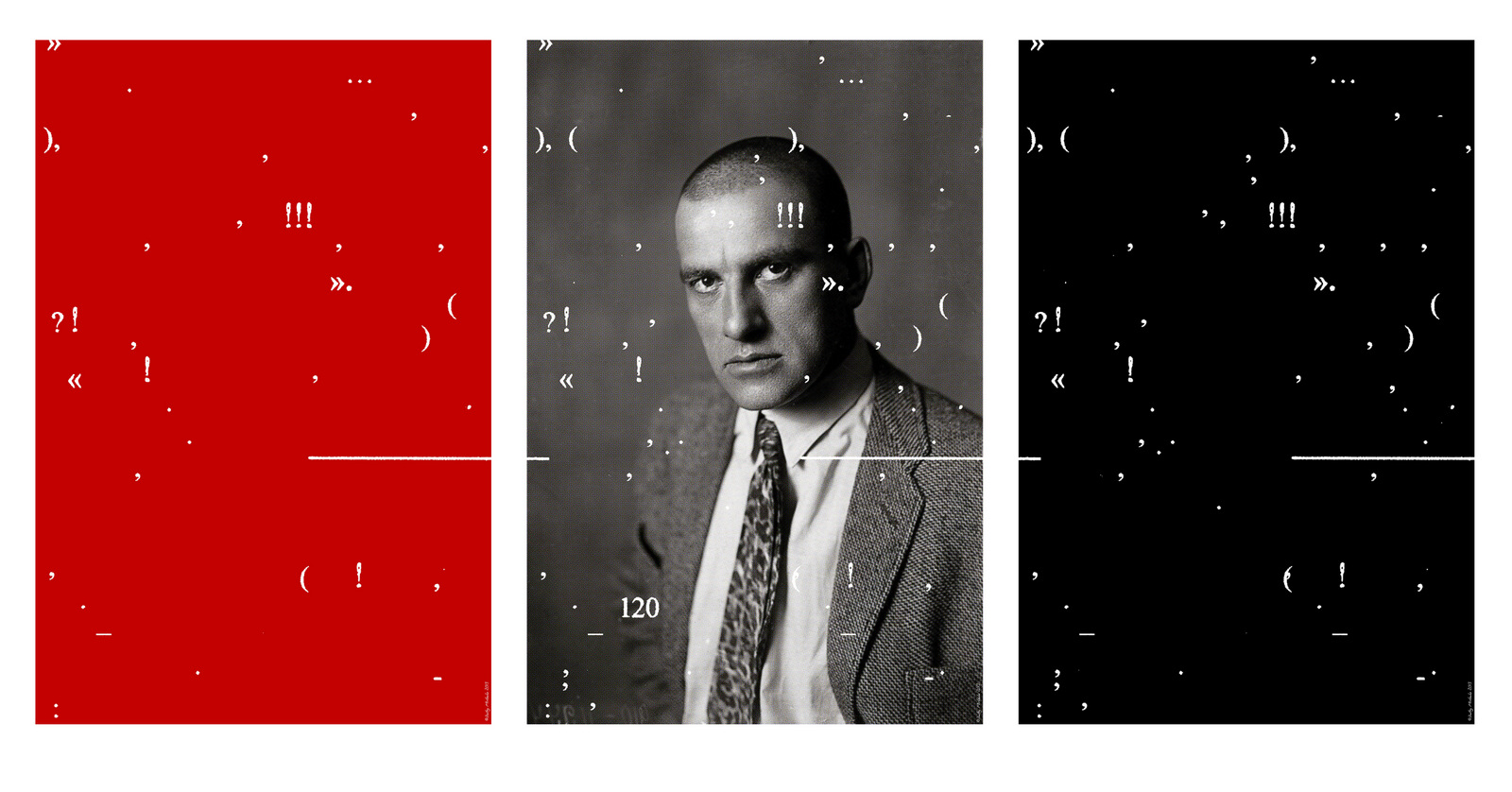 Potrójny plakat Dmitrija Mirilenki, wykorzystujący jedną z fotografii Aleksandra Rodczenki, stanowi niezwykle liryczny komentarz na temat postaci Władimira Majkowskiego, tragicznie zmarłego poety-rewolucjonisty. Trzyczęściowa forma ukazuje etapy życia artysty w zwięzły, ale tkliwy sposób. Znaki typograficzne, które wydają się dryfować na powierzchni projektu, wskazują na charakter pracy Majakowskiego. Brak liter zachęca jednak czytelnika do użycia wyobraźni i dopowiedzenia sobie tego, co nie zostało wyrażone wprost.