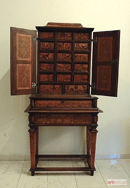 Mebel naśladuje w formie i dekoracji sprzęty wykonywane od pocz. XVI do końca XVII wieku, służące przede wszystkim celom dekoracyjnym i reprezentacyjnym, a także do przechowywania cennych drobiazgów i osobliwości. Mebel kilkakrotnie reperowany, w dużym stopniu rekonstruowany (część szufladek wewnętrznych, listwy profilowe szufladek i płycin drzwiczek, gzymsy, podnóże). Pierwotnie, kabinet przeznaczony był do postawienia na stole lub innym meblu, a zamiast podstawy miał kuliste lub konsolowe nóżki.