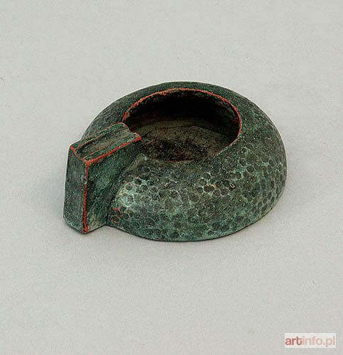 w formie silnie spłaszczonej półkuli z nieregularnym, kolistym otworem; boki z licznymi, chaotycznie rozmieszczonymi, kolistymi wgnieceniami (jak na metalowych wyrobach epoki) oraz przydanym elementem graniastosłupowym z półcylindrycznym wyżłobieniem na oparcie papierosa