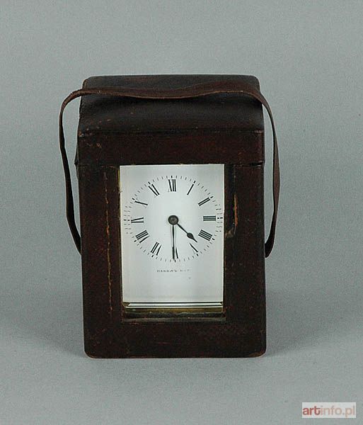w prostopadłościennej, mosiężnej obudowie, oszklonej z 4 stron, z owalnym oszklonym otworem u góry, tu także ruchomy uchwyt; front prostokątny, emaliowany, biały, krąg minut i rzymskich cyfr godzin czarny, pod nim napis cyrylicą: Paweł Bure (częściowo zatarty), wskazówki czernione; mechanizm z naciągiem sprężynowym, wychwytem kotwicznym i regulatorem balansowym, wsparty na dwóch pionowych, mosiężnych płytach, na odwrocie: nr 19476 oraz wyciskane ozn. forma stożka o falistych bokach (?).