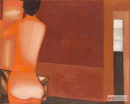 olej/płótno, 80 x 100 cm sygnowany, datowany i opisany na odwrociu: 'WNĘTRZE | Z | AKTEM | JERZY | NOWOSIELSKI | 1971' oraz dedykacja: 'Kochanej | Pani Basi | w | dniu imienin | J.N. | 4.XII.74' na odwrociu naklejka Muzeum Sztuki w Łodzi - wywozowa na Festiwal Sztuki w Edynburgu w 1972