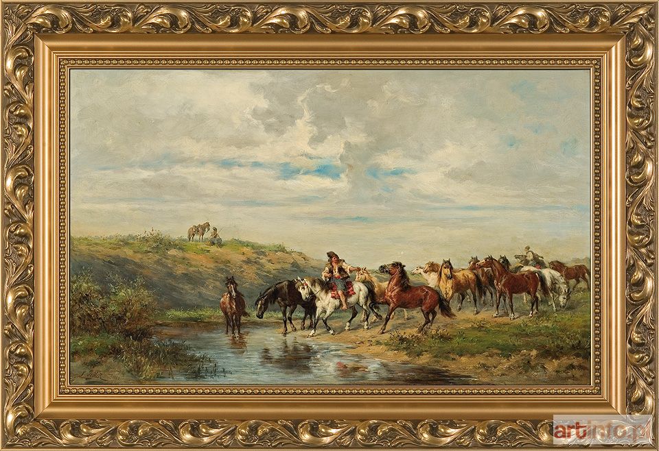 olej, deska, 41.8 x 68.5 cm sygnowany l.d.: L Gedłek. Wien 1880 Na odwrocie nalepka (druk, atrament) o treści: L`ÉTRIER BELGE SOCIÉTÉ COOPERATIVE | 19. Avenue Vanden Elschen, BRUXELLES | Exposition l`Art et l`Équitation | du 9 mai au 1er juin 1936 | No 162 | Auteur: L. Gedlek Huile | Titre de l`oeuvre: Chevaux a l`Abreuvoir | XIX | Preteur : M. Chiode (?) Behaegel - | 59. av. De la Toison d`or. Bruxelle. Ponadto ślad po innej, niezachowanej, nalepce; napis ołówkiem: 354; nieczytelny owalny stempel.