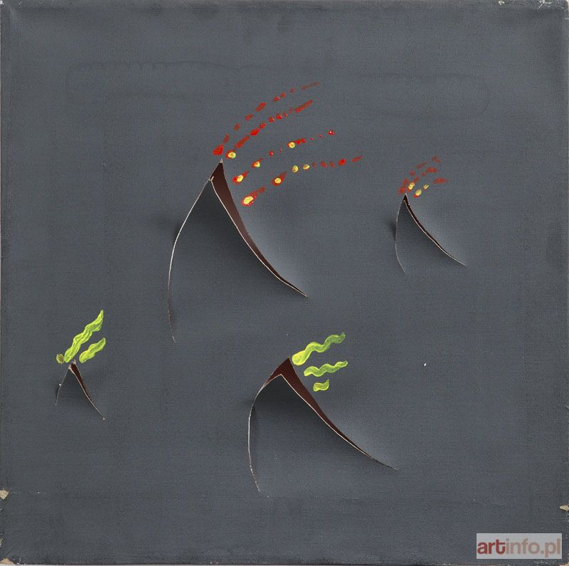 akryl, technika własna/płótno, 50 x 50 cm sygnowany, datowany i opisany na odwrociu, na blejtramie: `1968 NATALIA LACH LACHOWICZ "HOMAGE LUCIANO FONTANA`