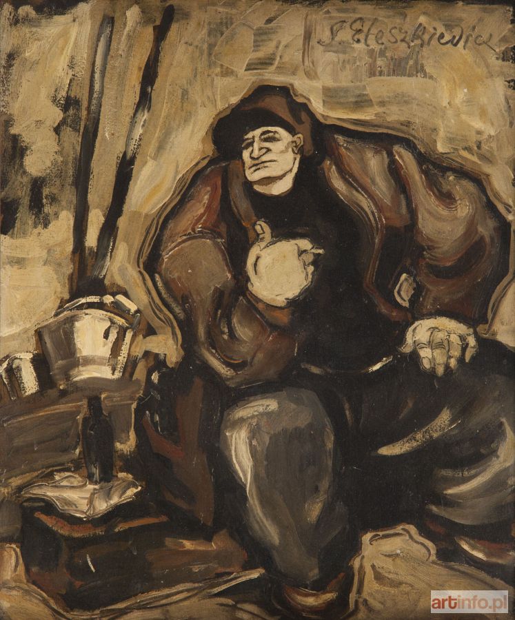 olej/sklejka, 45 x 38 cm sygnowany p.g.: 'S. Eleszkiewicz' na odwrociu opisany: 'SEATED LABOURER | STANISLAS ELESZKIEWICZ'