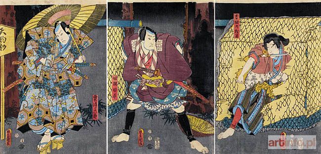 Tryptyk, na którym artysta ukazał całopostaciowe podobizny słynnych aktorów teatru kabuki z Edo, w dynamicznych pozach charakterystycznych dla kreowanych przez nich ról. Dziesiątki podobnych portretów aktorskich przyniosły Kunisadzie sławę i dziś należą do najbardziej charakterystycznych prac tego twórcy, uważanego za jednego z najwybitniejszych przedstawicieli schyłkowego okresu szkoły Utagawa. Ten tryptyk należy do jednej z ciekawszych prac tego rodzaju.