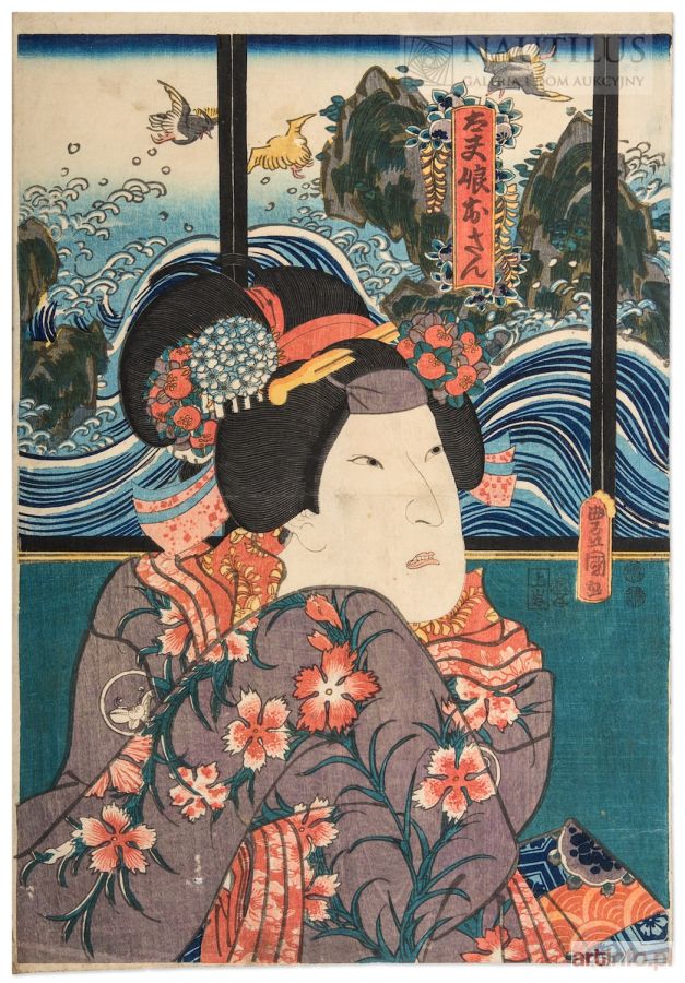 Drzeworyt barwny; wym.: 369 x 255 mm; pieczęcie nanushi (cenzorskie; stosowane w l. 1847-1853): Hama oraz Magomi Kangeyu; sygn. w kartuszu Toshidama: Toyokuni ga; piękna odbitka ze śladami słojów deski na kimonie, odbitka bez konserwacji, wzory na kimonie oraz fale morza wypukłe. Niewielki ubytek w l. dolnego rogu, pionowe i poziome zgięcie.