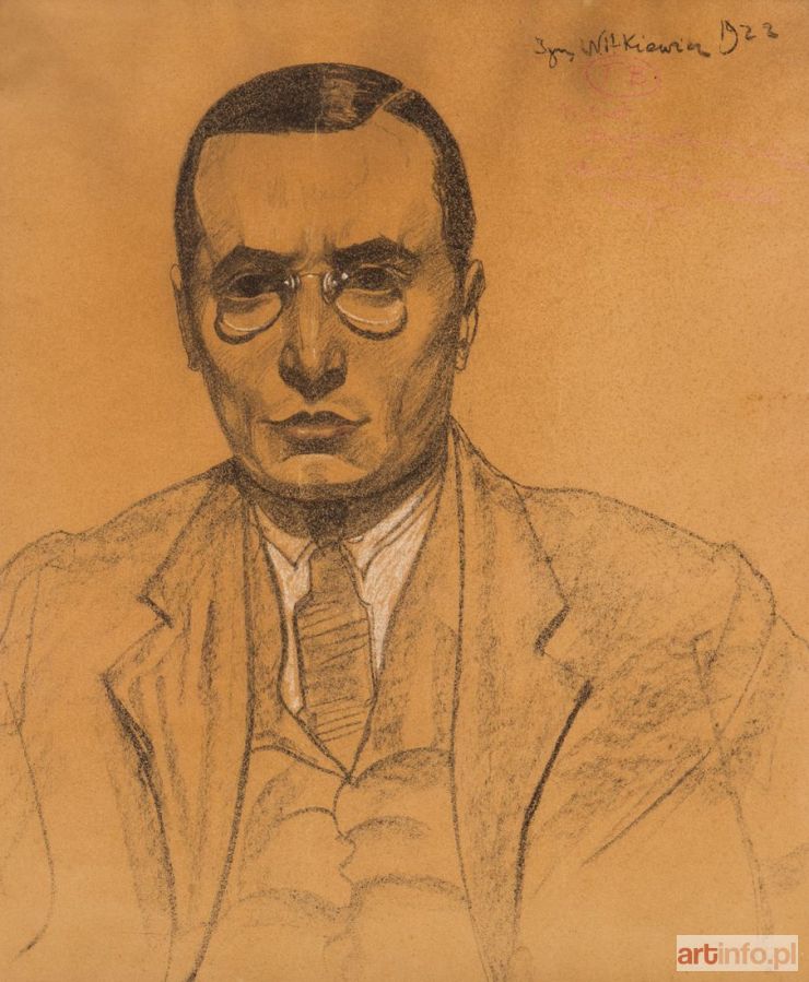 Jerzy Kordowski (1893 Warszawa - 1966 Skolimów) aktor teatralny. W 1910 r. ukończył gimnazjum w Częstochowie, następnie pracował jako pisarz na Kolei Warszawsko-Wiedeńskiej. W 1914 -1917 następnie służył w wojsku rosyjskim. W 1917 r. zaangażował się do Teatru Polskiego w Mińsku Litewskim. W 1918 powrócił do Warszawy. Grał w wielu miastach Polski, m. in. w Wilnie, Toruniu, Poznaniu, Katowicach i Warszawie. W okresie II wojny światowej przebywał we Lwowie, gdzie grał w Polskim Teatrze Dramatycznym. W 1945 przeniósł się do Katowic i grał w Teatrze Śląskim. Następnie grał w Krakowie, Bydgoszczy, a od sezonu 1948/49 do przejścia na emeryturę w 1964 r. pracował jako aktor i reżyser w Teatrze Polskim w Poznaniu. Był ceniony za znakomity warsztat i kulturę sceniczną. Stanisław Ignacy Witkiewicz, syn Stanisława - malarza, krytyka i pisarza. Pseudonim artystyczny - Witkacy. Znany też ze swoich dokonań na polu literatury i dramatu. Oficer gwardii carskiej w I wojnie światowej. W 1914 roku odbył długą podróż, ekspedycję naukową do Australii wraz z Bronisławem Malinowskim. Wychowany w aurze modernizmu w Krakowie i Zakopanem. Teoretyk sztuki, formista, współpracownik "Zwrotnicy", twórca teorii "Czystej Formy" - "Wartość dzieła sztuki nie zależy od uczuć życiowych w nim zawartych ani od doskonałości odtworzenia przedmiotów, a jedynie polega na jednolitości konstrukcji czystych elementów formalnych." Uważał, że twórczość artystyczna jest sposobem wyrażenia " uczucia metafizycznego" Do połowy lat 20 tworzył malarskie fantazje, które dziś można określić jako pośrednie między modernizmem, ekspresjonizmem a surrealizmem. Od tego też czasu uprawiał głównie twórczość literacką, która przyniosła mu z czasem światową sławę. Artysta zginął tragicznie w 1939 roku. Popełnił samobójstwo w obliczu sowieckiego najazdu na Polskę, który potraktował jako koniec cywilizacji. Tworzył prace malarskie w pracowni portretowej, gdzie obowiązywał cennik i wzory do zamówienia kolejnych "odejść" od realizmu portretowanej osoby na rzecz jej artystycznej wizji ekspresjonistycznej. Twórczość portretowa Witkacego była przez długi czas odbierana jako ekstrawagancja artystyczna i osobliwość. Weryfikację i potwierdzenie geniuszu artysty przyniosły następne lata. Typ B to w Regulaminie Firmy Portretowej: rodzaj bardziej charakterystyczny niż A, jednak bez cienia karykatury. Robota bardziej kreskowa niż typu A z pewnym odcieniem cech charakterystycznych, co nie wyklucza "ładności" w portretach kobiecych. Stosunek do modela obiektywny. Portret Jerzego Kordowskiego idealnie spełnia te założenia.