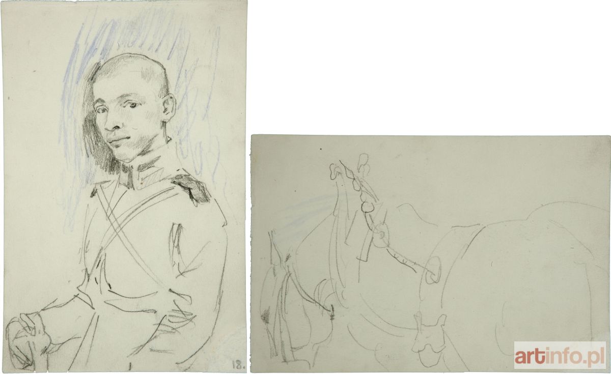 ołówek, kredka fioletowa, papier; 17 x 11,1 cm verso: Studium uprzęży konia z pochyloną głową, ukazanego od tyłu z lewego boku ołówek; papier; 11,1 x 17 cm