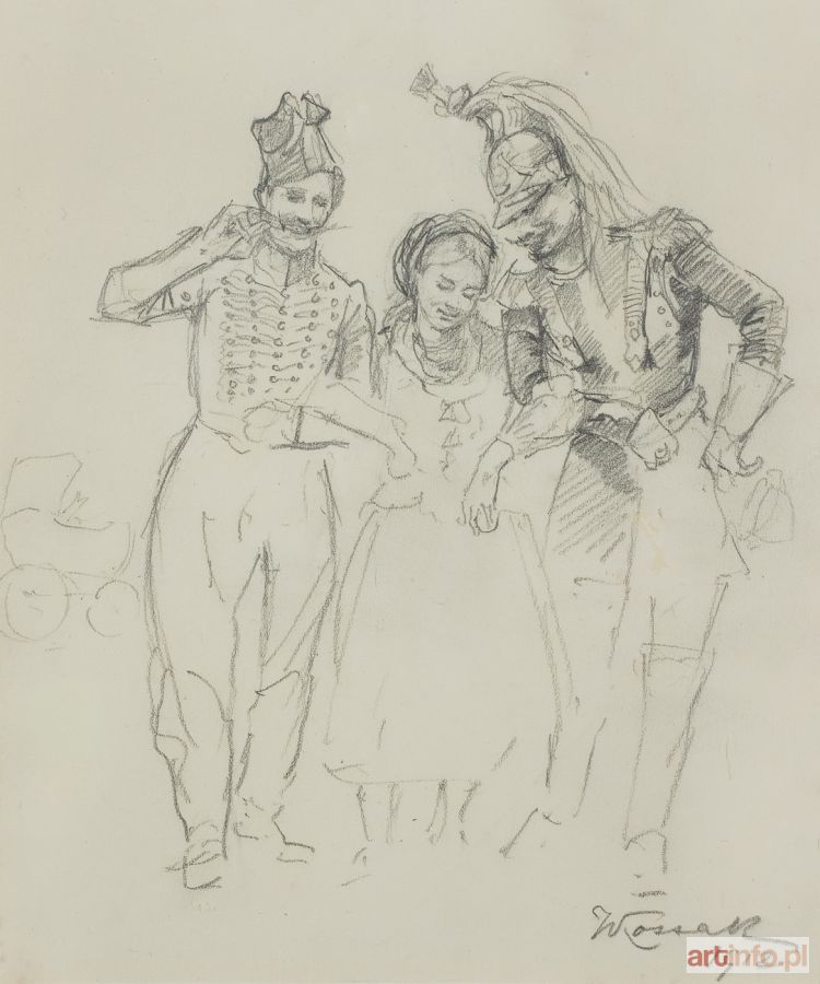Rysunek Dziewczyna i żołnierze powstał jako wstępny projekt, pomysł ilustracji do Wspomnień Wojciecha Kossaka. Ta bogato ilustrowana książka wydana nakładem Gebethnera i Wolffa, ukazała się w Krakowie w roku 1912 (wyd. II; 1913), a w rok później także w Berlinie. Zawierała liczne ilustracje czarno-białe i kilka kolorowych. Wśród nich były fotografie, 14 reprodukcji obrazów wcześniejszych i 54 ilustracje specjalnie do książki wykonane.